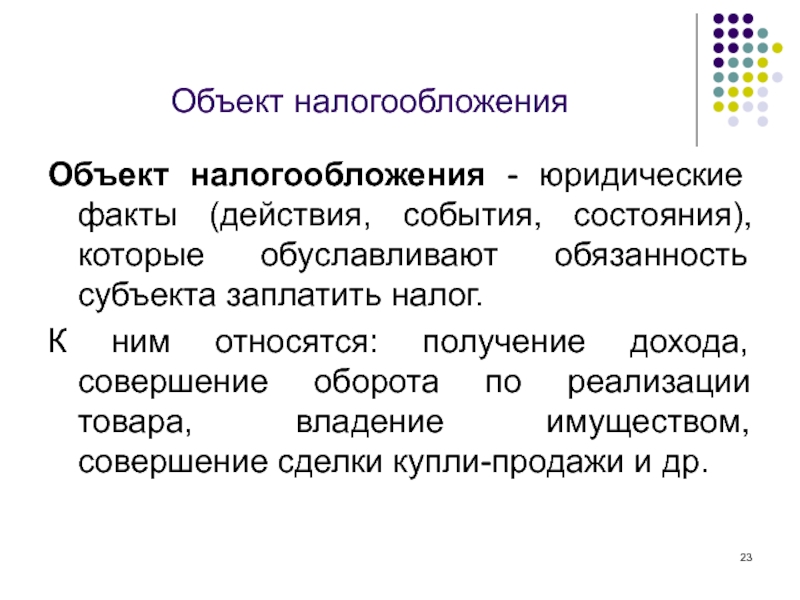 Объект налогообложения - юридические факты (действия, события, состояния), которые