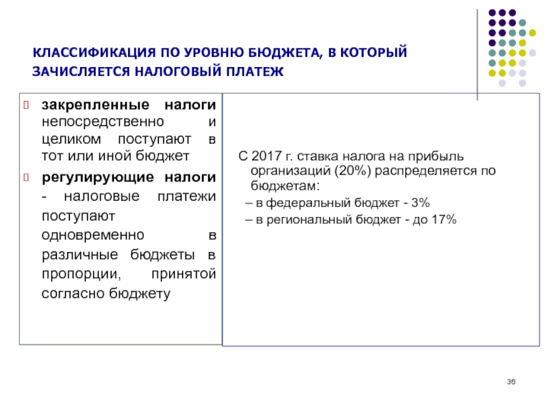 Слайд 36КЛАССИФИКАЦИЯ ПО УРОВНЮ БЮДЖЕТА, В КОТОРЫЙ ЗАЧИСЛЯЕТСЯ НАЛОГОВЫЙ ПЛАТЕЖ