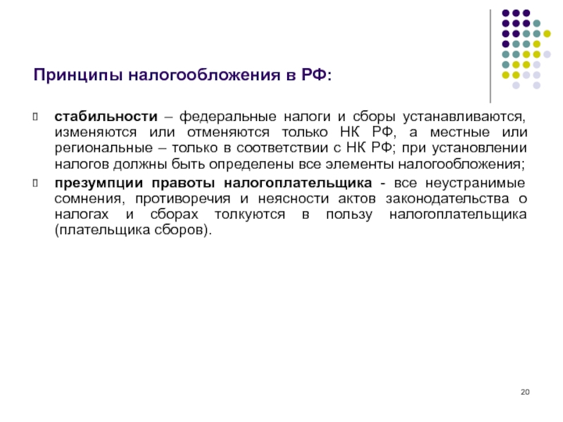федеральные налоги - элементы определяются законодательством РФ и являются едиными на всей ее территории; их устанавливает и вводит в действие высший представительный орган; эти налоги могут зачисляться в бюджеты различных уровней.
