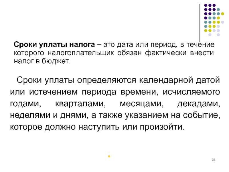 Слайд 33Сроки уплаты определяются календарной датой или истечением периода времени, исчисляемого