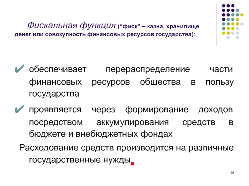 Слайд 16Фискальная функция (“фиск” – казна, хранилище денег или совокупность финансовых