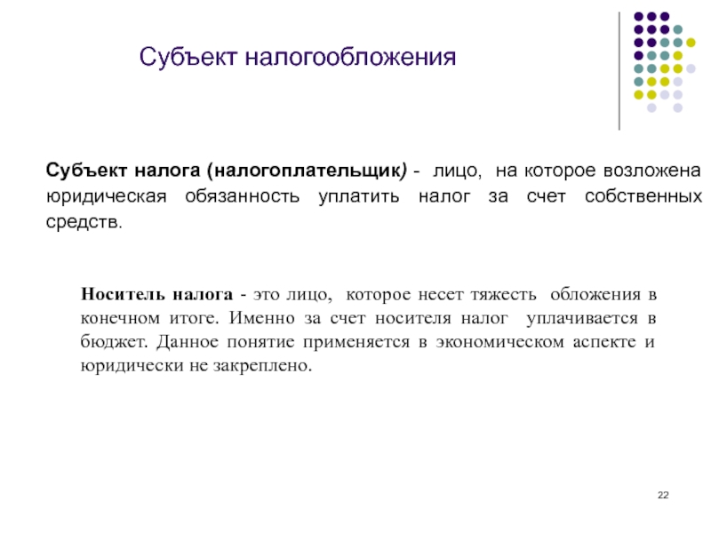 Слайд 22Субъект налога (налогоплательщик) - лицо, на которое возложена юридическая обязанность
