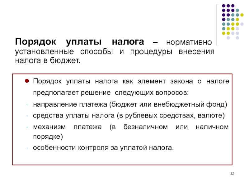 Слайд 32Порядок уплаты налога – нормативно установленные способы и процедуры внесения