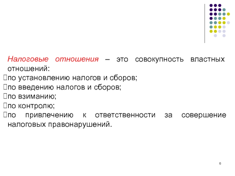 Слайд 6Налоговые отношения – это совокупность властных отношений: