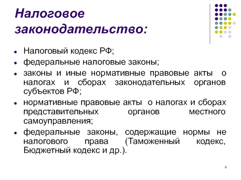 федеральные законы, содержащие нормы не налогового права (Таможенный кодекс, Бюджетный кодекс и др.).