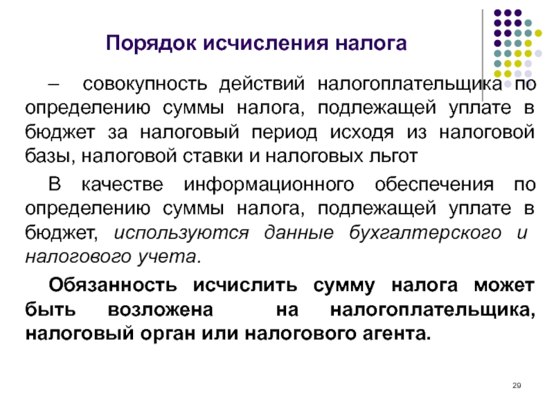 Обязанность исчислить сумму налога может быть возложена на налогоплательщика, налоговый орган или налогового агента.