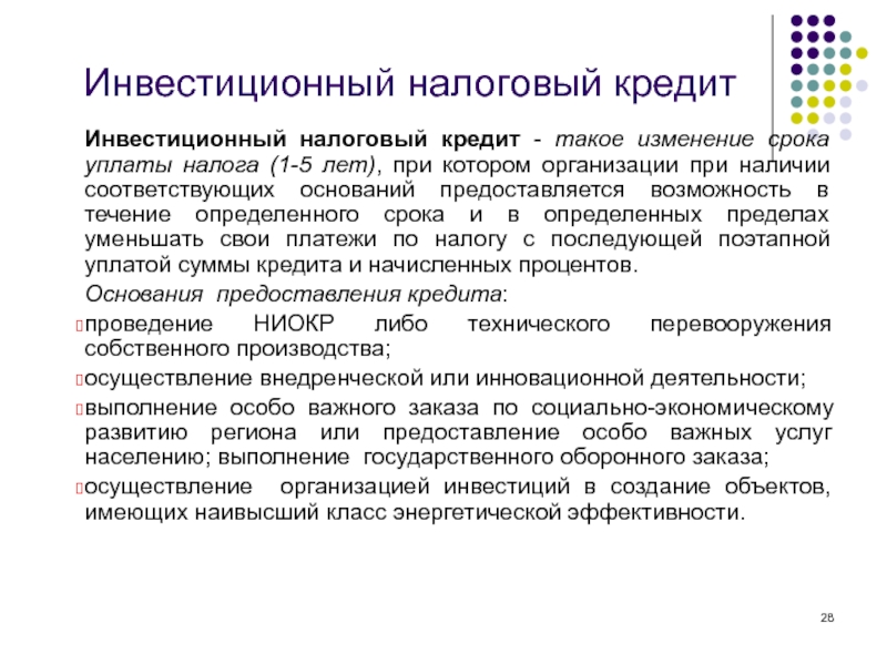 Слайд 28Инвестиционный налоговый кредит - такое изменение срока уплаты налога (1-5