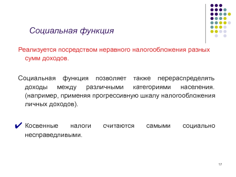 3.социальная — сглаживание неравенства в уровнях доходов населения за счет прогрессивной системы налогообложения, поддержки соответствующих слоев граждан, создания института социальной защиты населения;
