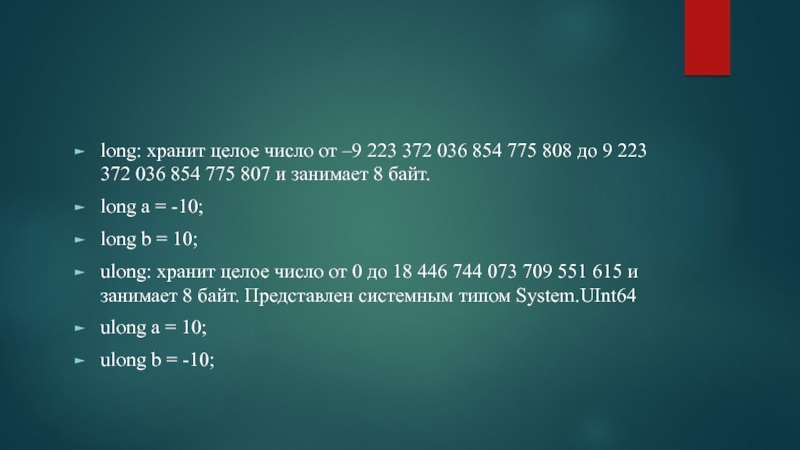 Слайд 6long: хранит целое число от –9 223 372 036 854