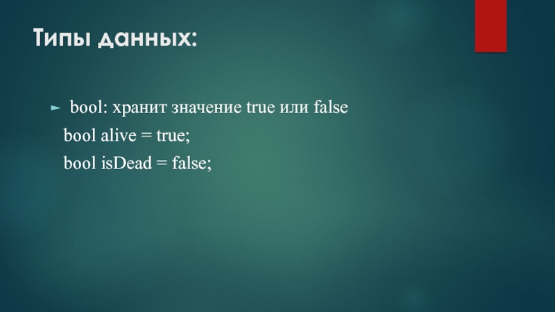Типы данных: bool: хранит значение true или falsebool alive = true;bool isDead = false;