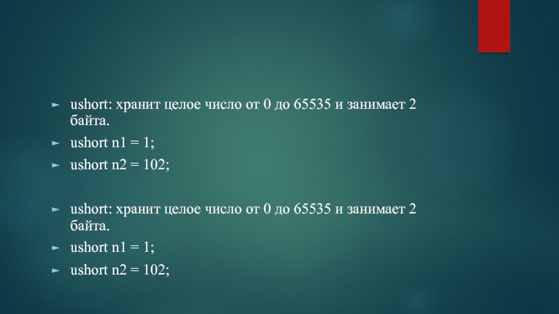 Слайд 4ushort: хранит целое число от 0 до 65535 и занимает