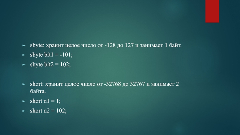 Слайд 3sbyte: хранит целое число от -128 до 127 и занимает
