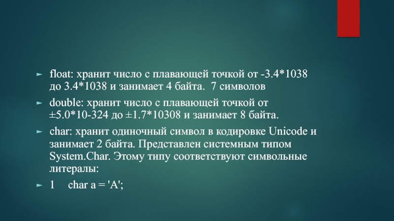 Слайд 7float: хранит число с плавающей точкой от -3.4*1038 до 3.4*1038