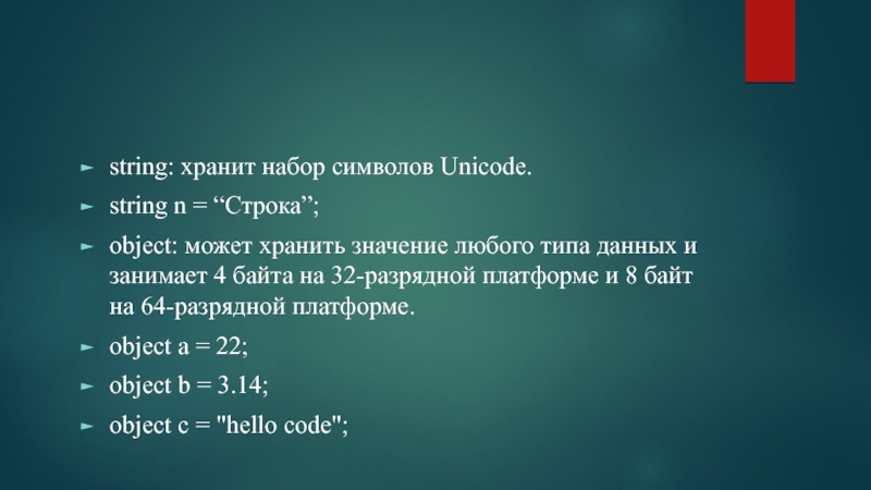 string: хранит набор символов Unicode.string n = “Строка”;object: может хранить значение любого типа данных и занимает 4