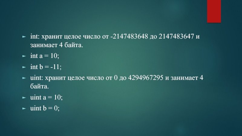Слайд 5int: хранит целое число от -2147483648 до 2147483647 и занимает