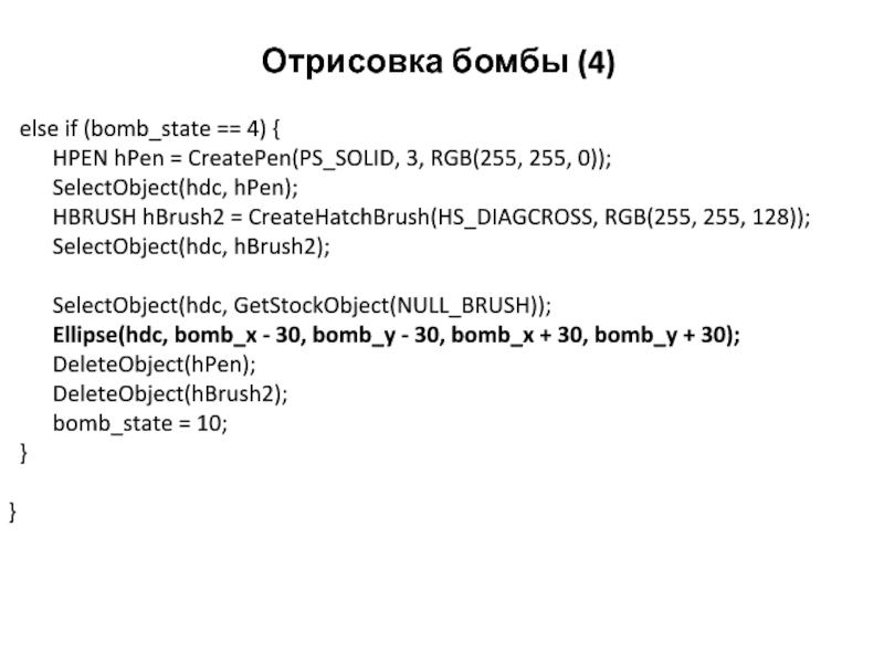 Ellipse(hdc, bomb_x - 30, bomb_y - 30, bomb_x + 30, bomb_y + 30);