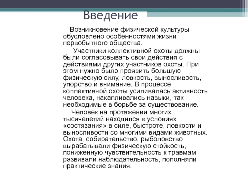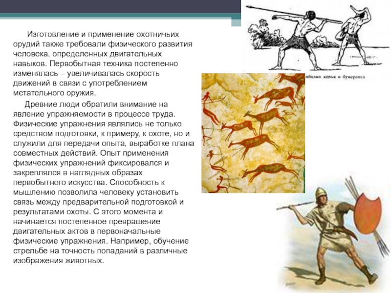 должны были согласовывать свои действия с действиями других участников охоты. При этом нужно было проявить большую физическую силу, ловкость, выносливость, упорство и внимание. В процессе коллективной охоты усиливалась активность человека, накапливались навыки, так необходимые в борьбе за существование.Человек на протяжении многих тысячелетий находился в условиях «состязания» в силе, быстроте, ловкости и выносливости со многими видами животных. Охота, собирательство, рыболовство вырабатывали физическую стойкость, пониженную чувствительность к травмам развивали наблюдательность, пополняли практические знания.