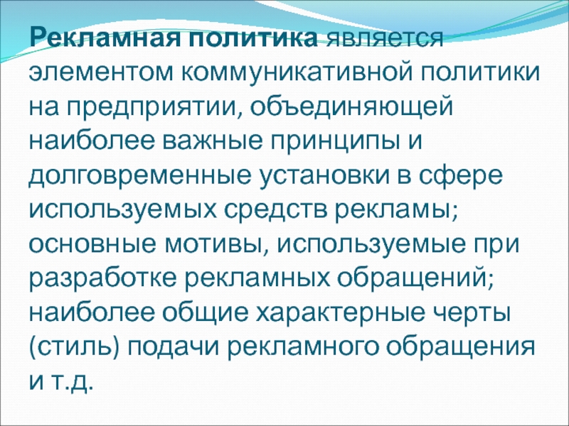 Слайд 7Рекламная политика является элементом коммуникативной политики на предприятии, объединяющей наиболее
