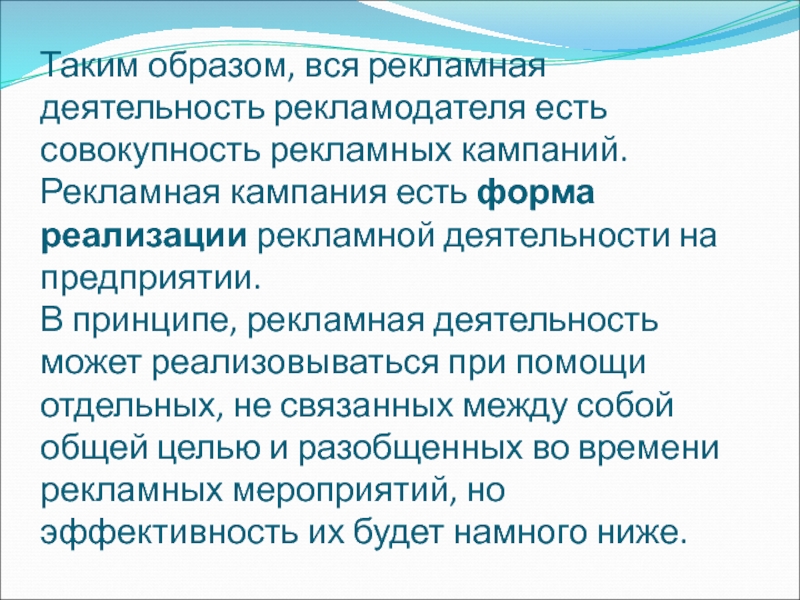 Слайд 26Таким образом, вся рекламная деятельность рекламодателя есть совокупность рекламных кампаний.