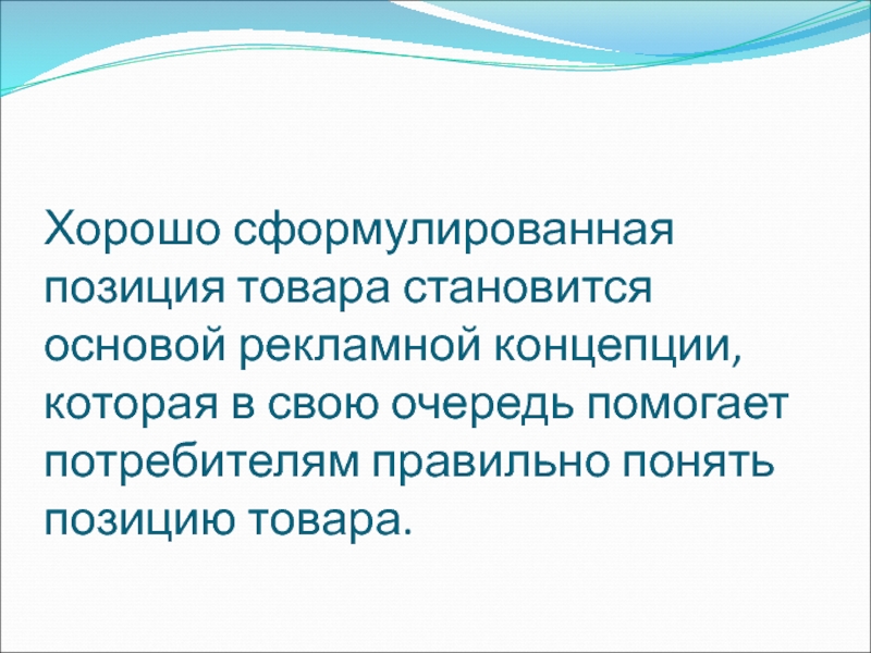 Слайд 20Хорошо сформулированная позиция товара становится основой рекламной концепции, которая в
