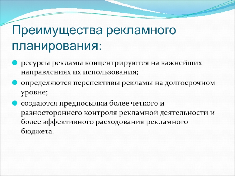 Слайд 6Преимущества рекламного планирования: