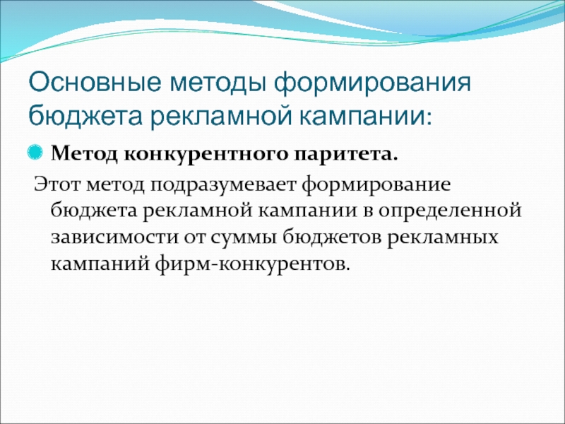 Слайд 60Основные методы формирования бюджета рекламной кампании: