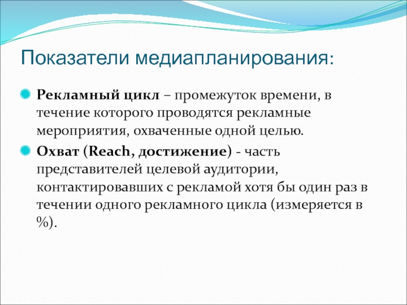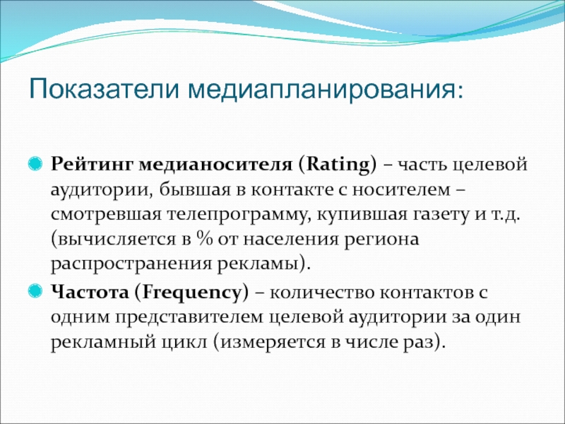 Слайд 72Показатели медиапланирования: