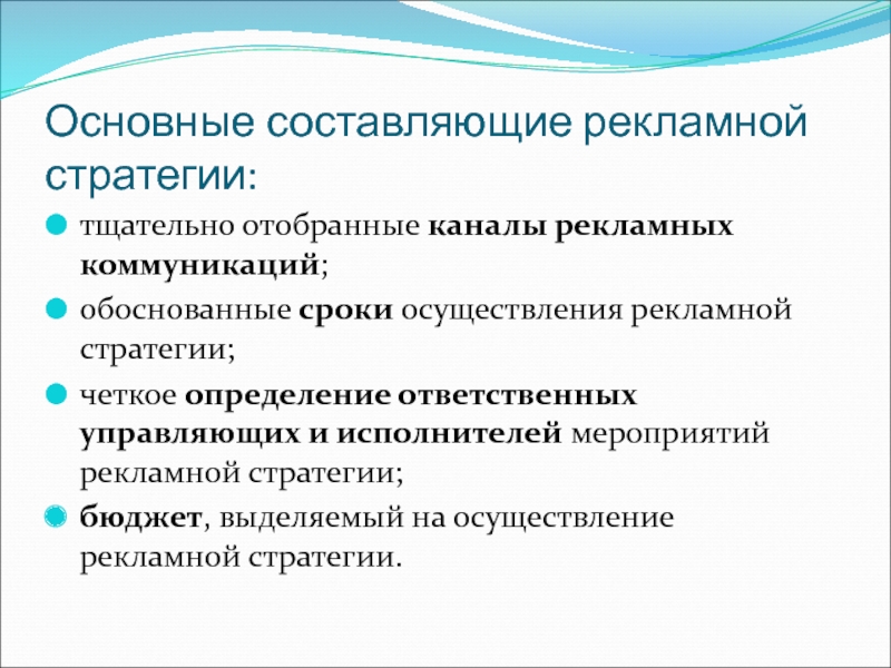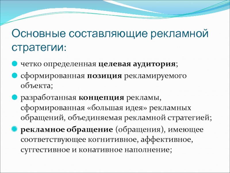 Слайд 13Основные составляющие рекламной стратегии: