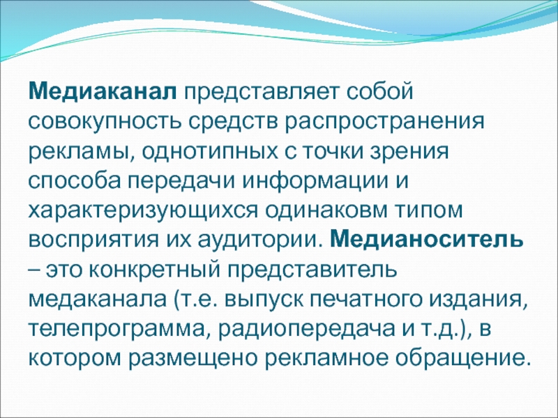 Слайд 69Медиаканал представляет собой совокупность средств распространения рекламы, однотипных с точки
