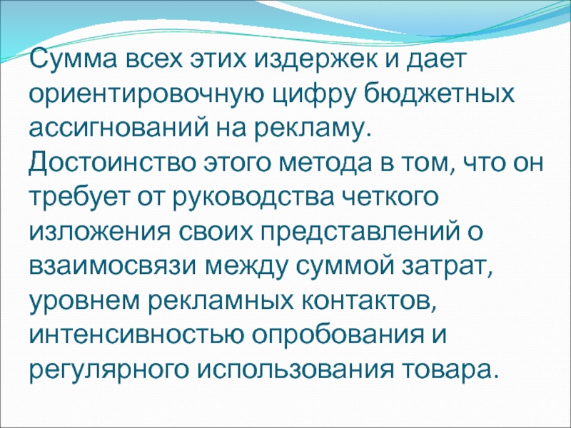 мере учитывает имеющиеся возможности рекламодателя. Этот метод строится на рассуждениях о том, что сбыт является причиной рекламы, а не следствием.