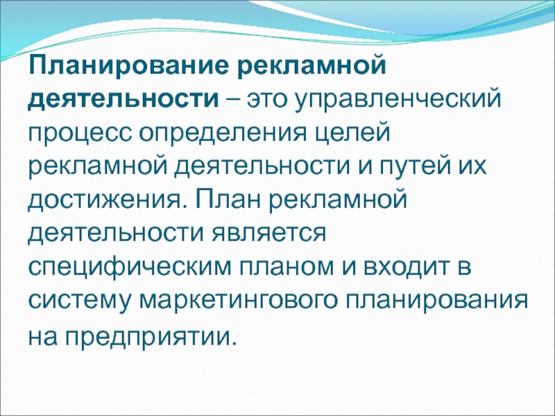 Слайд 4Планирование рекламной деятельности – это управленческий процесс определения целей рекламной