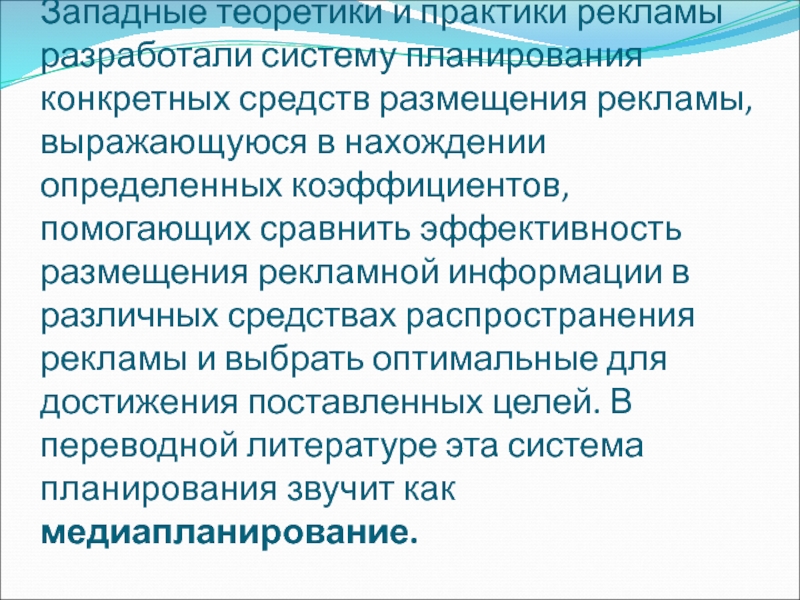 Слайд 67Западные теоретики и практики рекламы разработали систему планирования конкретных средств