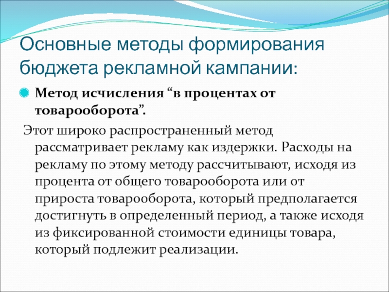 Слайд 52Основные методы формирования бюджета рекламной кампании:
