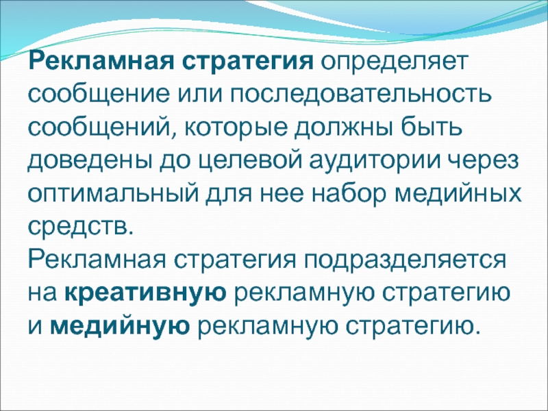 Слайд 11Рекламная стратегия определяет сообщение или последовательность сообщений, которые должны быть