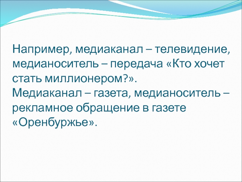 Слайд 70Например, медиаканал – телевидение, медианоситель – передача «Кто хочет стать