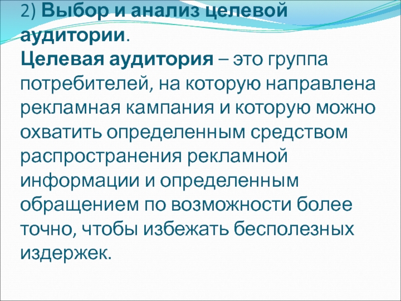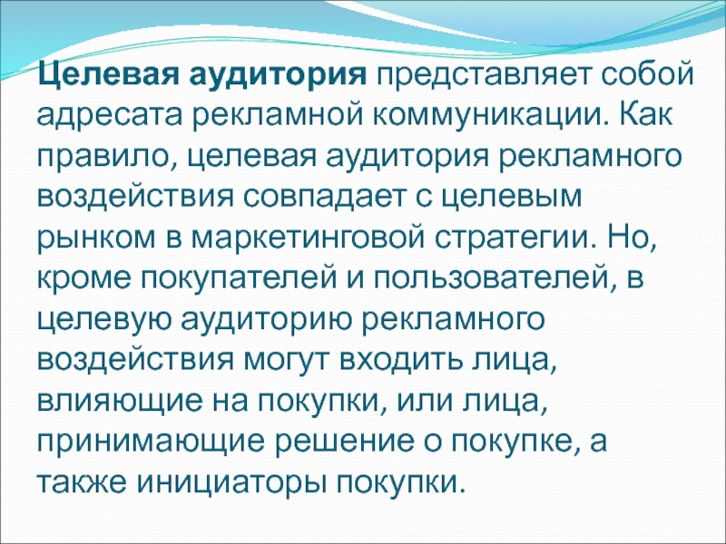 Слайд 14Целевая аудитория представляет собой адресата рекламной коммуникации. Как правило, целевая