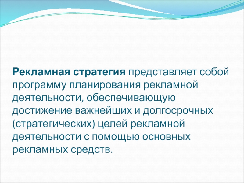Слайд 10Рекламная стратегия представляет собой программу планирования рекламной деятельности, обеспечивающую достижение