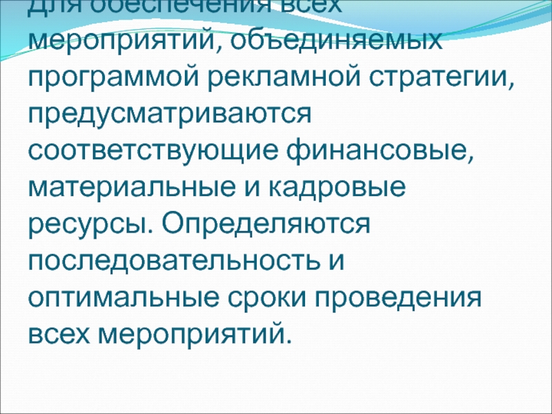 Слайд 22Для обеспечения всех мероприятий, объединяемых программой рекламной стратегии, предусматриваются соответствующие