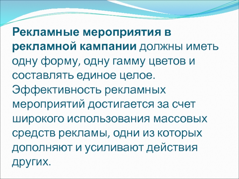 Слайд 27Рекламные мероприятия в рекламной кампании должны иметь одну форму, одну