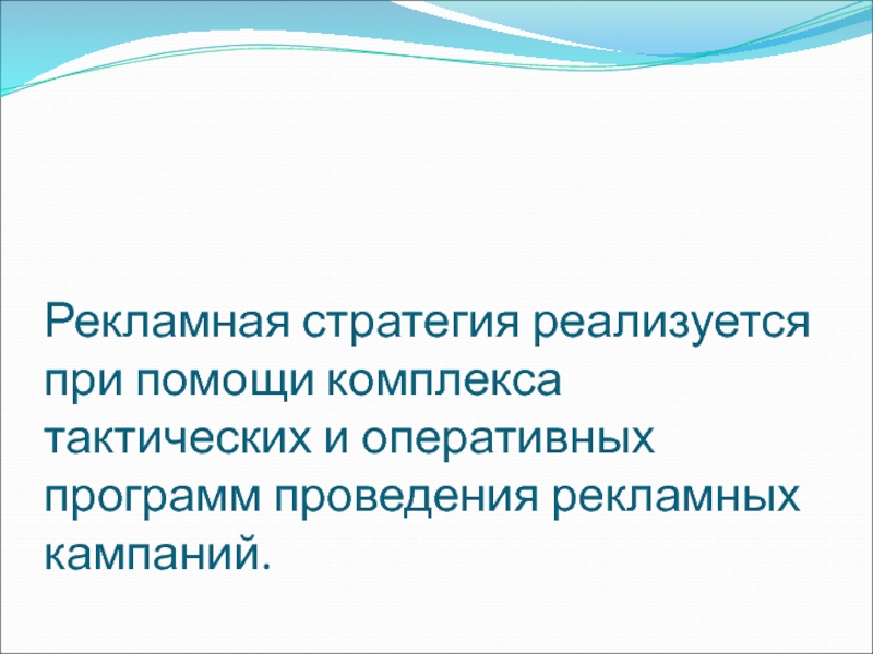 Слайд 23Рекламная стратегия реализуется при помощи комплекса тактических и оперативных программ