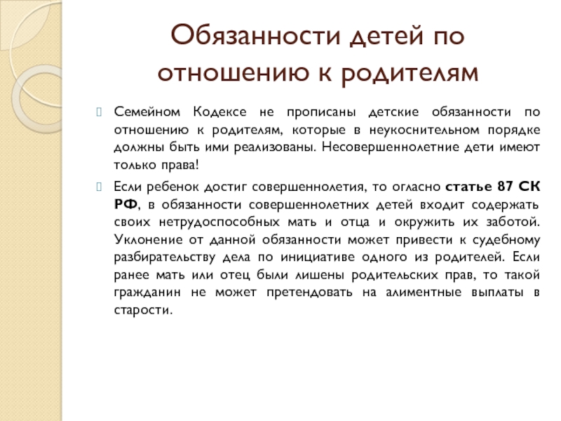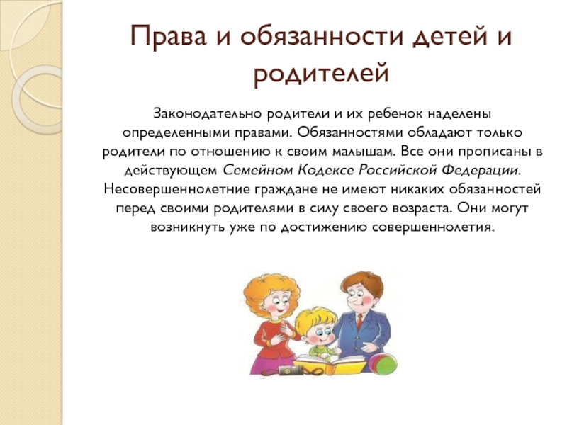 к своим малышам. Все они прописаны в действующем Семейном Кодексе Российской Федерации. Несовершеннолетние граждане не имеют никаких обязанностей перед своими родителями в силу своего возраста. Они могут возникнуть уже по достижению совершеннолетия.