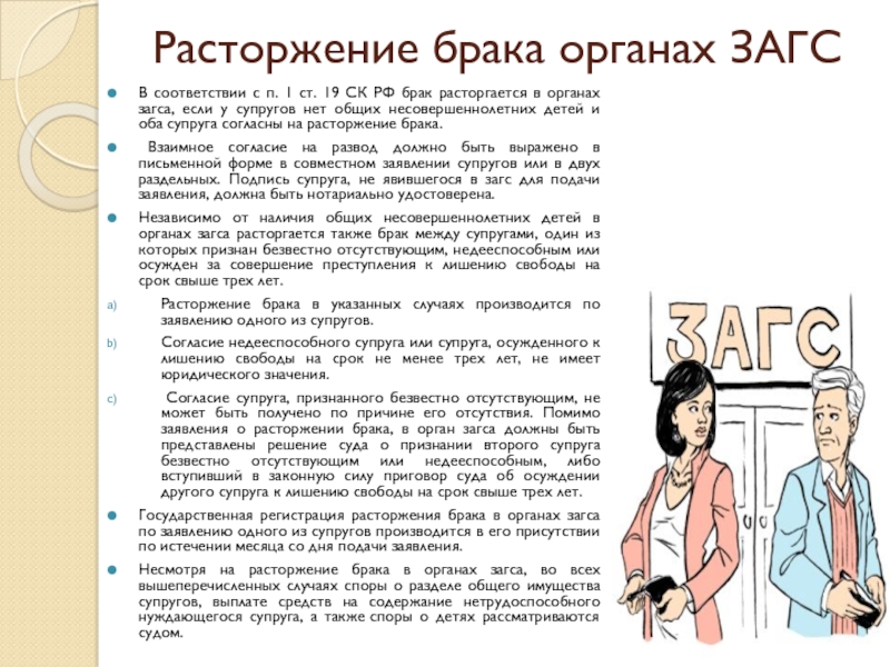 Независимо от наличия общих несовершеннолетних детей в органах загса расторгается также брак между супругами, один из которых признан безвестно отсутствующим, недееспособным или осужден за совершение преступления к лишению свободы на срок свыше трех лет.