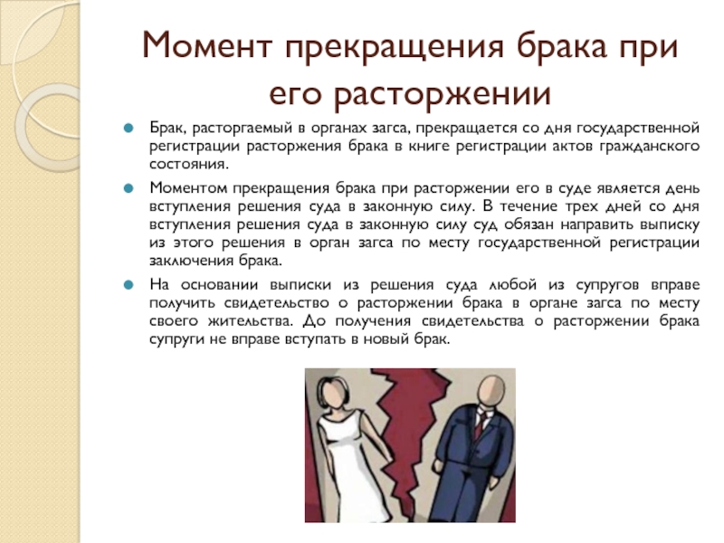 Моментом прекращения брака при расторжении его в суде является день вступления решения суда в законную силу. В течение трех дней со дня вступления решения суда в законную силу суд обязан направить выписку из этого решения в орган загса по месту государственной регистрации заключения брака.