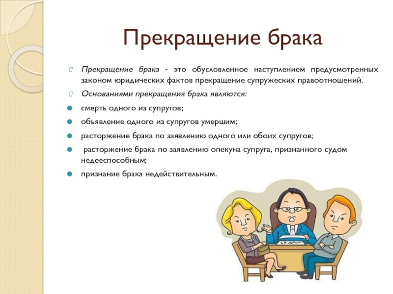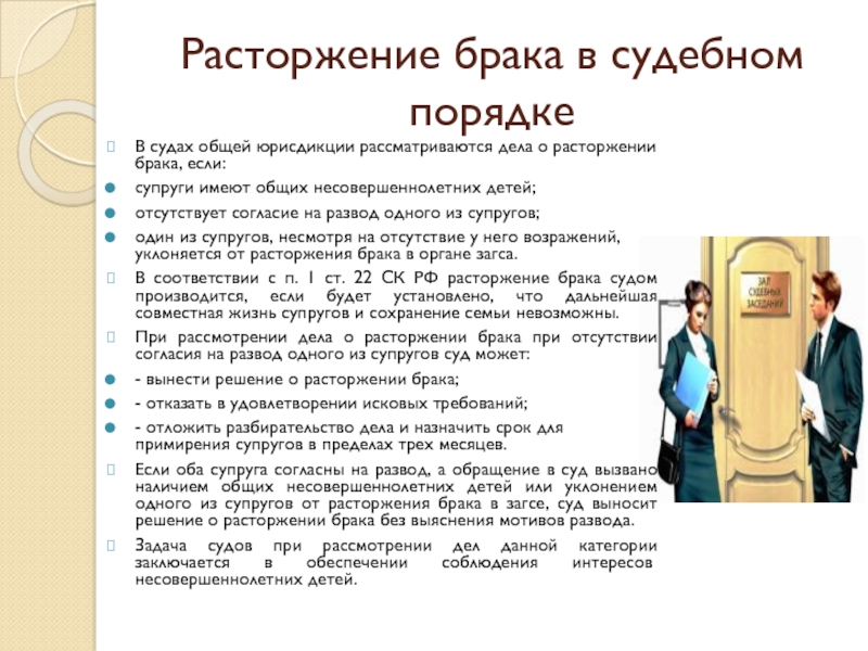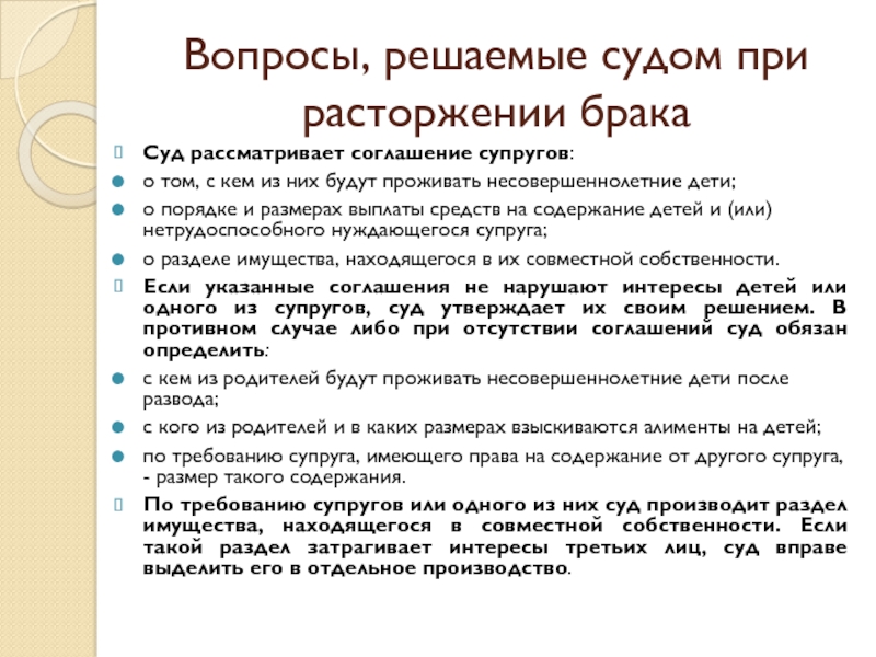 Слайд 18Вопросы, решаемые судом при расторжении брака