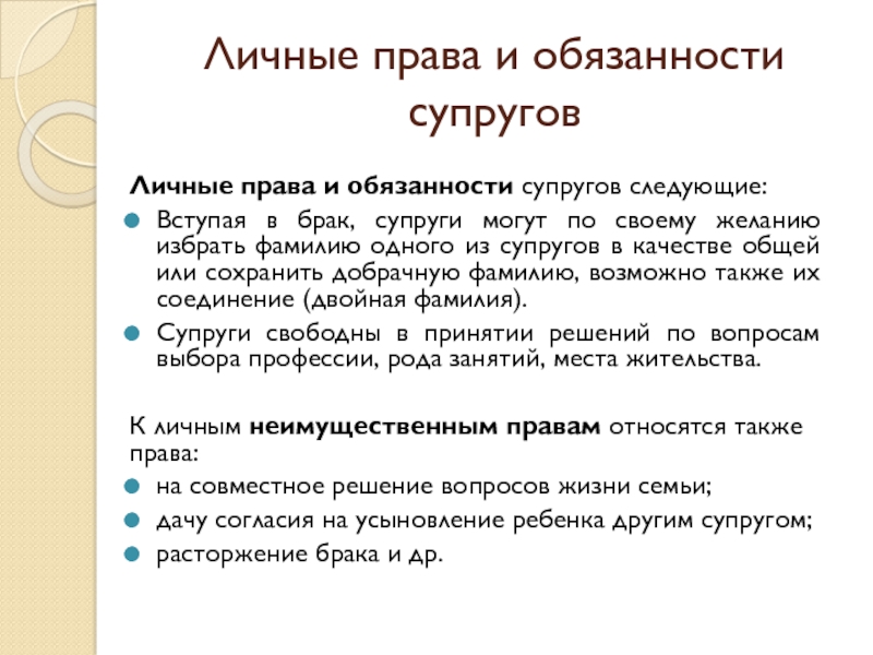 В законе особо подчеркивается, что супружеские права и обязанности возникают только в зарегистрированном браке.
