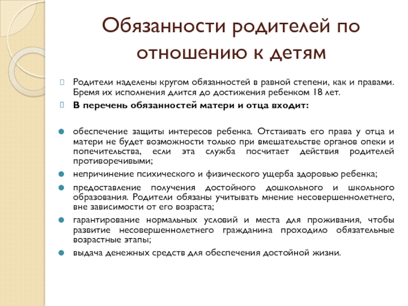 предоставление получения достойного дошкольного и школьного образования. Родители обязаны учитывать мнение несовершеннолетнего, вне зависимости от его возраста;