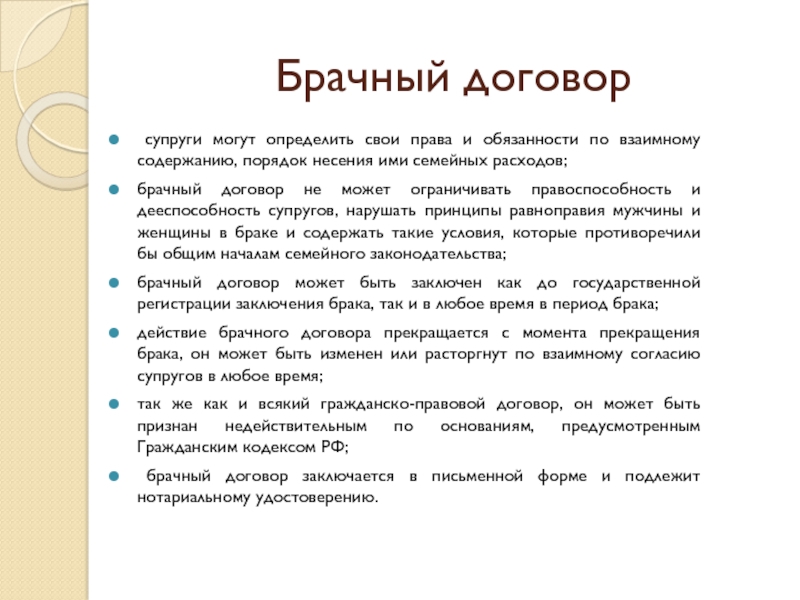 действие брачного договора прекращается с момента прекращения брака, он может быть изменен или расторгнут по взаимному согласию супругов в любое время;