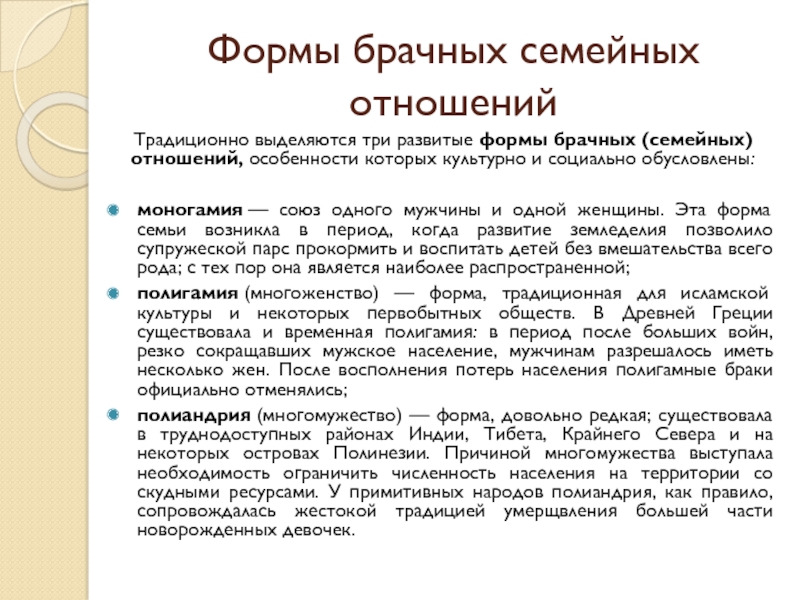 полигамия (многоженство) — форма, традиционная для исламской культуры и некоторых первобытных обществ. В Древней Греции существовала и временная полигамия: в период после больших войн, резко сокращавших мужское население, мужчинам разрешалось иметь несколько жен. После восполнения потерь населения полигамные браки официально отменялись;