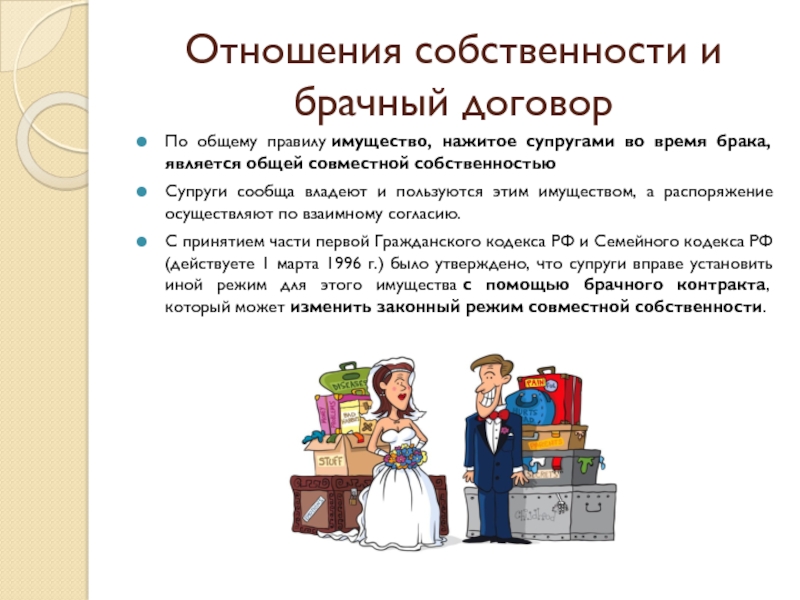 С принятием части первой Гражданского кодекса РФ и Семейного кодекса РФ (действуете 1 марта 1996 г.) было утверждено, что супруги вправе установить иной режим для этого имущества с помощью брачного контракта, который может изменить законный режим совместной собственности.