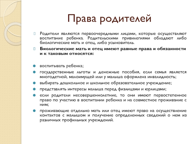 ребенок наделены определенными правами. Обязанностями обладают только родители по отношению